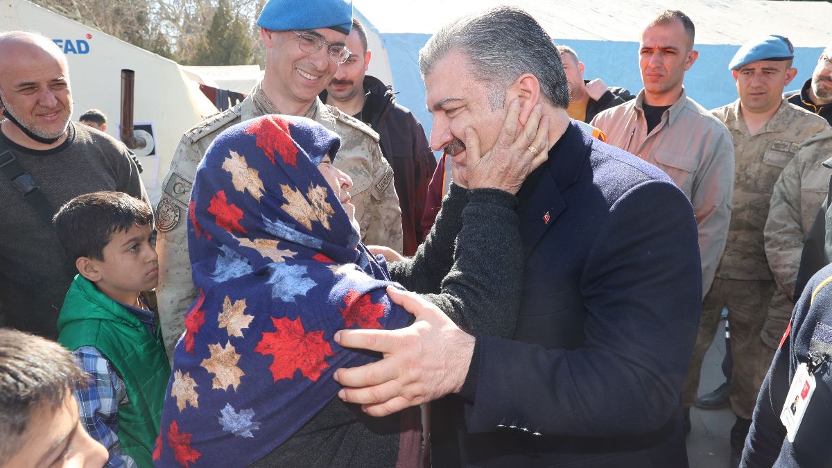 Yaşlı kadın, Bakan Koca’ya depremde yakınlarını kaybettiğini söyleyerek acısını paylaştı. Koca’da teselli ederek bol bol dua etmesini isteyerek “Bu afeti hep bir birlikte aşacağız. Bize bol bol dua et.” dedi.