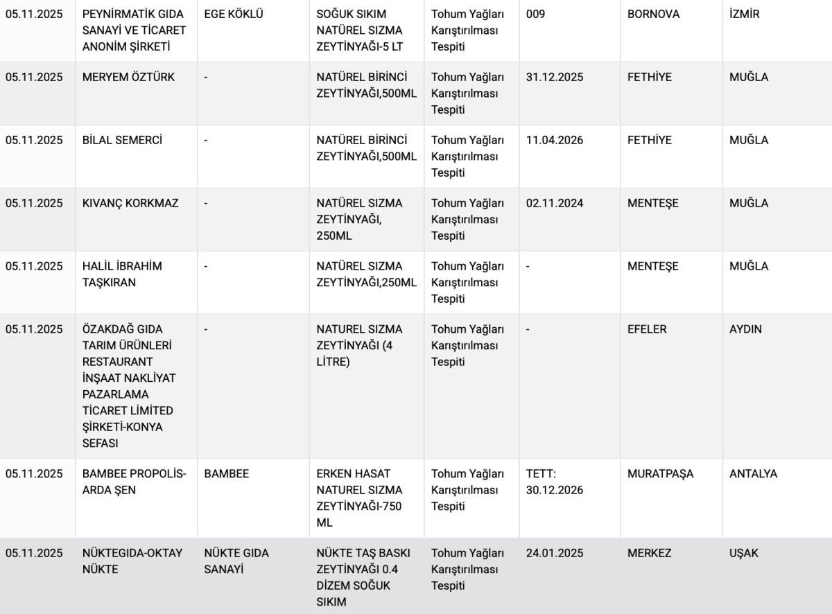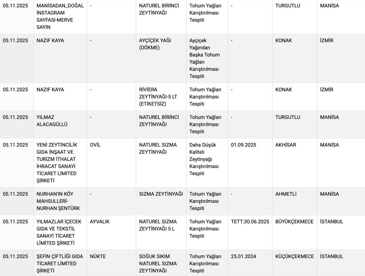 Son yayımlanan listede zeytinyağı ürünlerinde yapılan hileler dikkat çekti.