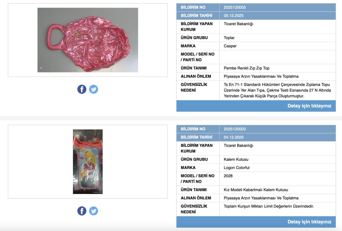- Casper marka zıp zıp top boğulma riski, Logon Colorful kalem kutusu ise kimyasal içeriği nedeniyle tehlikeli bulundu.