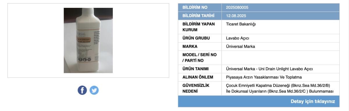 Yeni açıklamaya göre, evlerde sıkça tercih edilen Üniversal Marka’ya ait lavabo açıcı, önemli eksiklikler nedeniyle satıştan kaldırıldı.