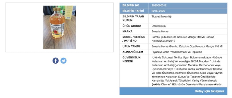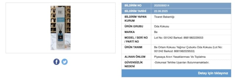 Be markasına ait Yağmur Çubuklu Oda Kokusu ve Brescia Home markasına ait Bambu Çubuklu Oda Kokusu, dokunsal tehlike uyarısı bulunmaması sebebiyle yasaklandı.