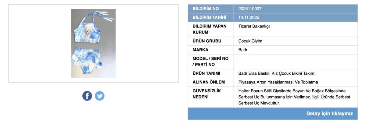 - "Badr" baskılı kız çocuk bikini takımı da güvenlik standartlarına uygun olmadığı için satıştan çekiliyor.