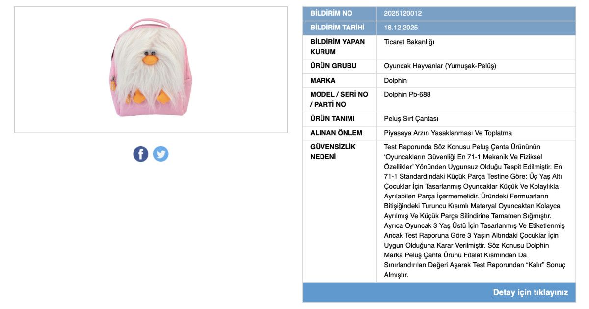 - Dolphin markalı pelüş sırt çantası güvensiz bulunarak toplatılıyor.