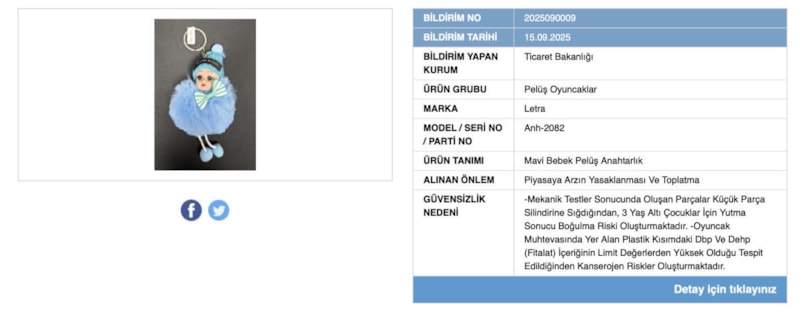 Güvensiz Ürün Bilgi Sistemi’ne eklenen yeni üründe, Letra marka peluş anahtarlık sağlık açısından riskli bulundu.