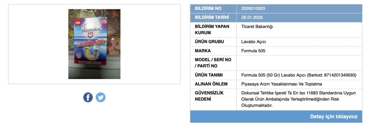 - Ticaret Bakanlığı, güvenlik testlerini geçemeyen Formula 505 marka lavabo açıcıyı toplatma kararı aldı.