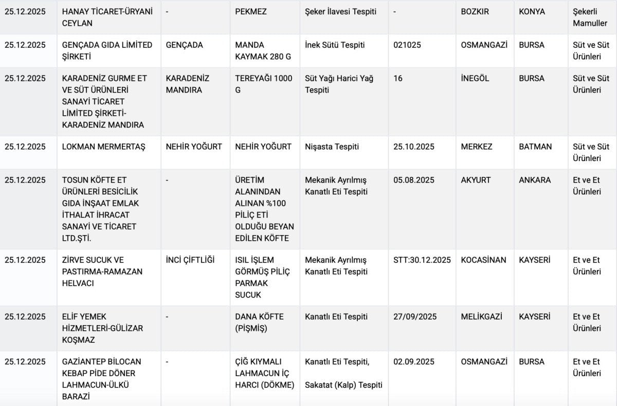 Açıklanan listede, günlük hayatta sıkça tüketilen birçok gıda ürününde mevzuata aykırı uygulamaların tespit edildiği görüldü.