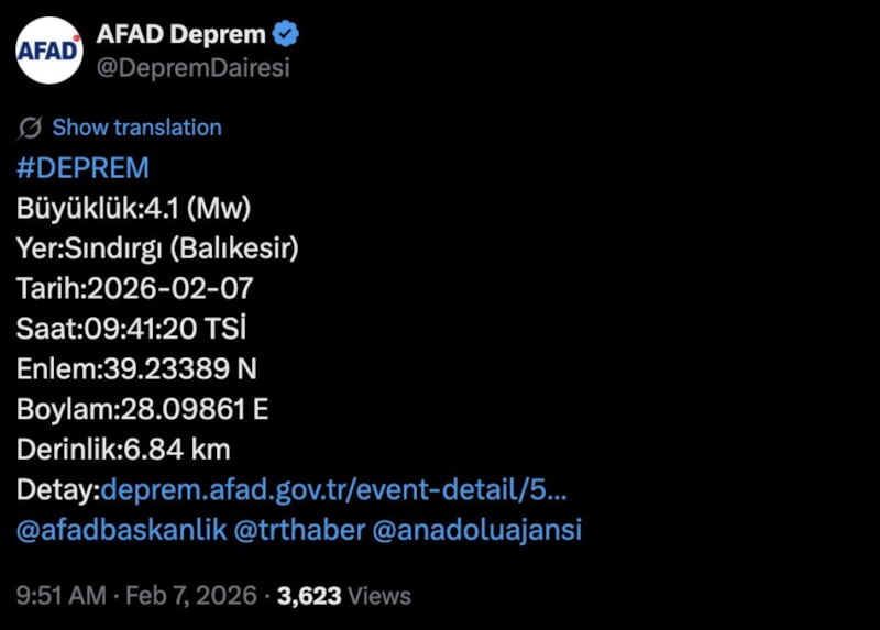 Sındırgı ilçesinde saat 09.41'de 4.1 büyüklüğünde bir sarsıntı kaydedildi.