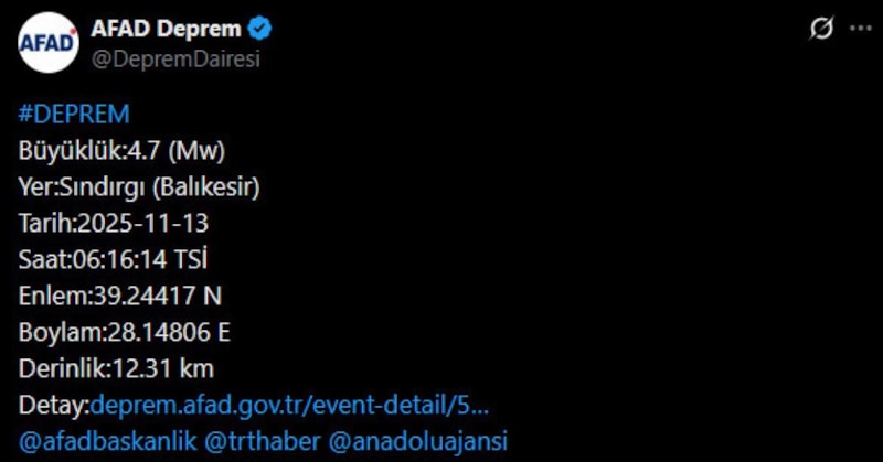 Afet ve Acil Durum Yönetimi Başkanlığının (AFAD) internet sitesinde yer alan bilgiye göre, merkez üssü Sındırgı ilçesi olan 4.7 büyüklüğünde sarsıntı kaydedildi.