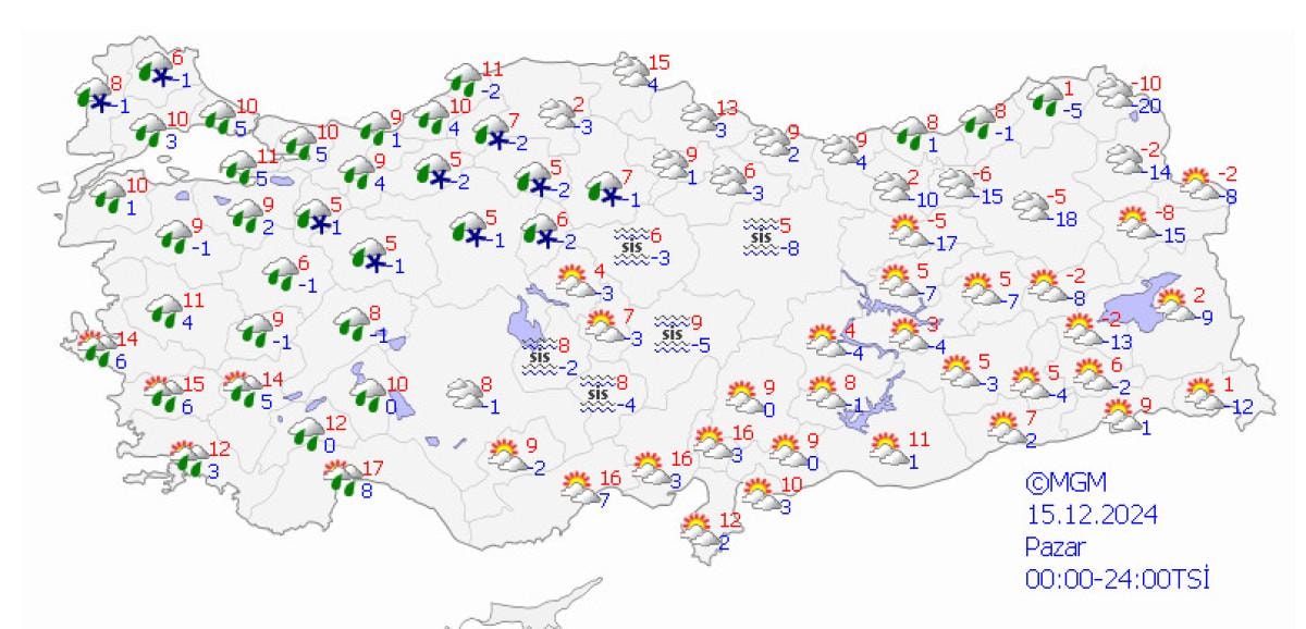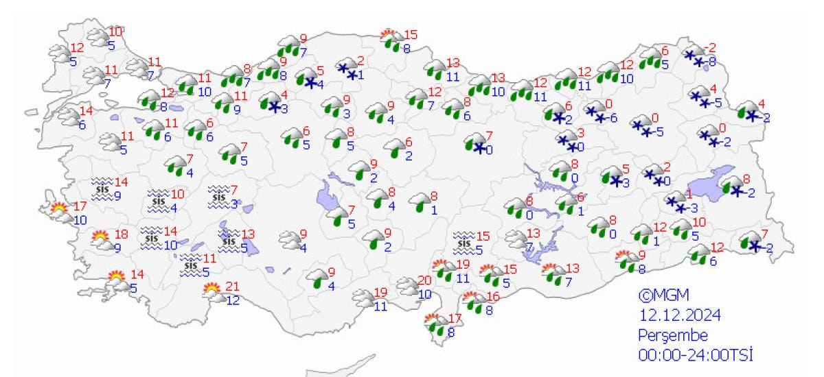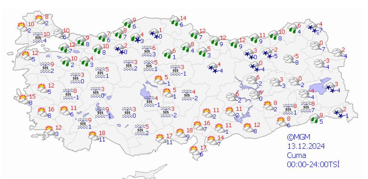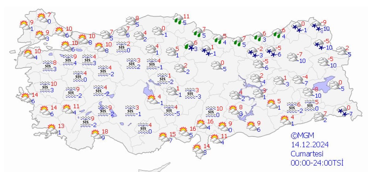 Yağışların; Marmara’nın güney ve doğusu, Kuzey ve Kıyı Ege ve Batı Karadeniz'de yerel kuvvetli olması bekleniyor. Ülkemizin doğu kesimlerinde buzlanma ve don olayı ile birlikte pus ve yer yer sis bekleniyor.