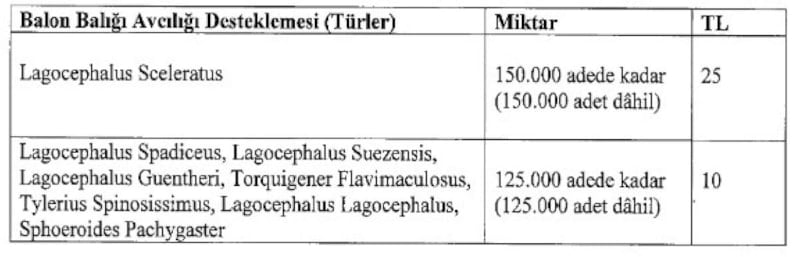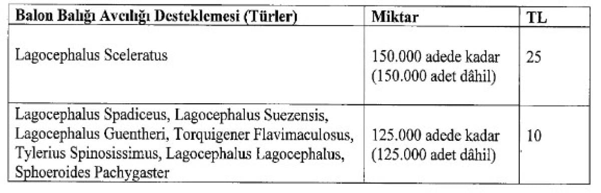 Karara göre balon balığını avlayan balıkçılara tane başı 25 TL, diğer türlerini avlayanlara da 10 TL destek ödemesi yapılacak.