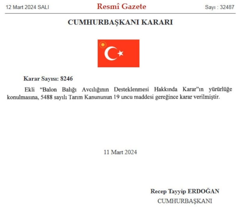 Cumhurbaşkanı Recep Tayyip Erdoğan’ın imzasıyla, Balon Balığı Avcılığının Desteklenmesi Hakkındaki Karar, Resmi Gazete’de yayınlanarka yürürlüğe girdi.