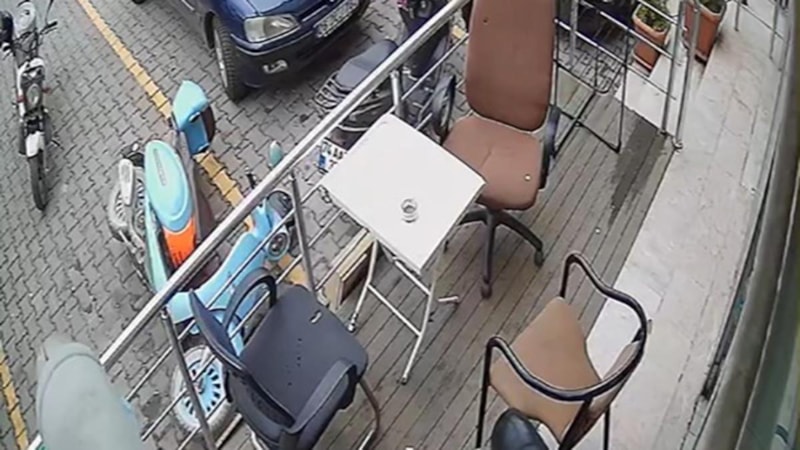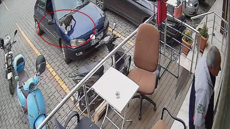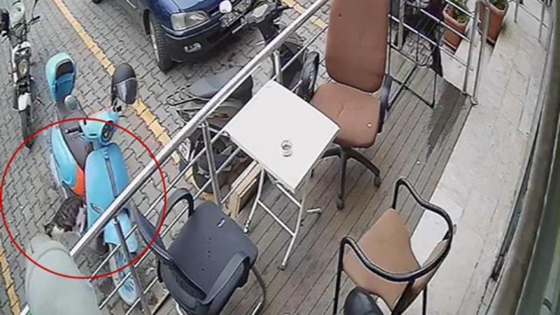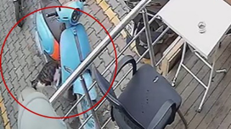 Motosikletin devrilmesi ve çıkan ses nedeniyle panikleyen kedi hızla alandan uzaklaşırken orada bulanan bir müşteri ise devrilen motosikletin çarparak hareket ettirdiği başka motosikleti tutmaya ve ne olduğunu anlamaya çalıştı.