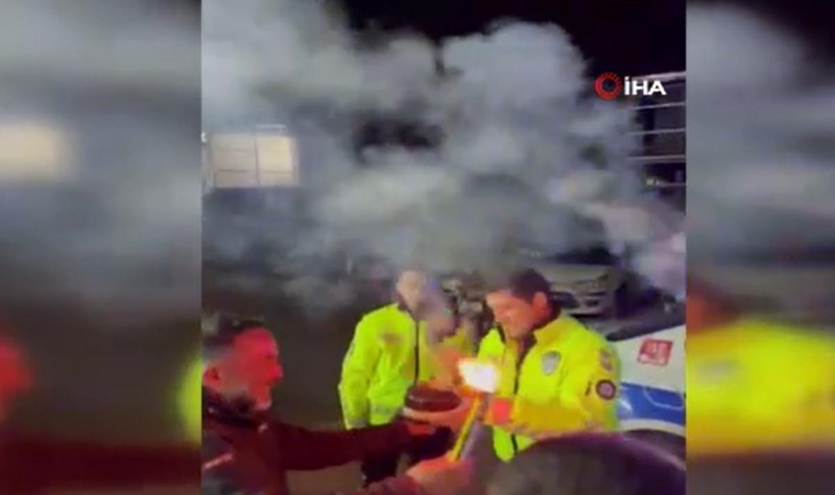 Polisleri meşalelerle karşılayan oto tamir ve bakım ustaları, polislere pasta da ikram etti.