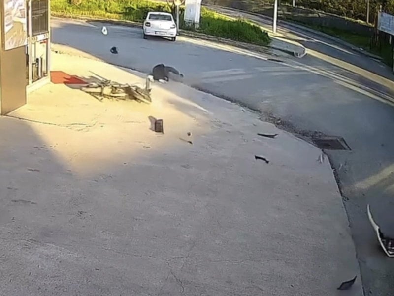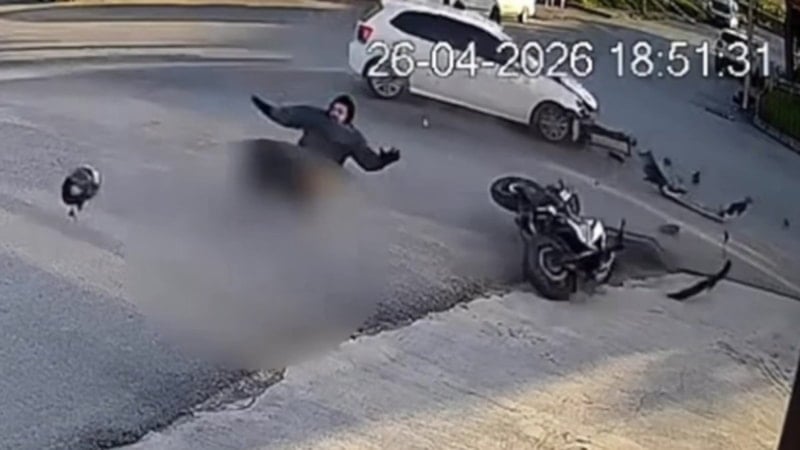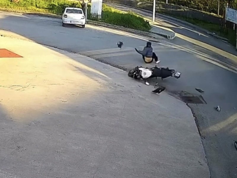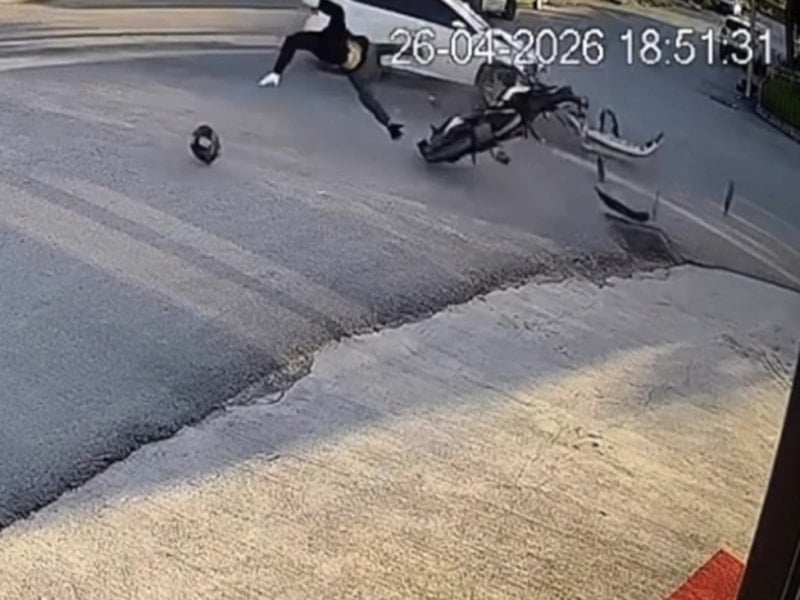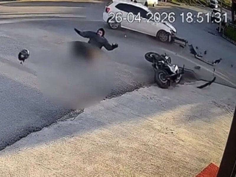 Görüntülerde yan yola girmek için manevra yapan otomobille motosikletin çarpışması ve motosiklet sürücüsünün savrulması yer alıyor.