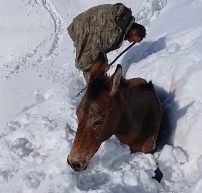 Bölgede devriye görevi yapan güvenlik korucuları tarafından fark edilen katır sürüsünde bir katırın donarak telef olduğu, bir diğerinin ise yarıya kadar kara saplanarak hareket edemediği belirlendi. Kara gömülen katır, korucuların yoğun çabası sonucu bulunduğu yerden çıkarıldı.