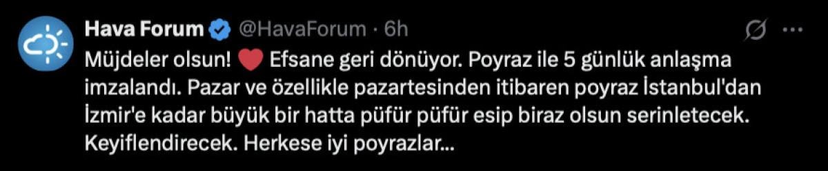 Paylaşımında, “Müjdeler olsun! Efsane geri dönüyor. Poyraz ile 5 günlük anlaşma imzalandı. Pazar ve özellikle pazartesinden itibaren poyraz İstanbul'dan İzmir'e kadar büyük bir hatta püfür püfür esip biraz olsun serinletecek. Keyiflendirecek. Herkese iyi poyrazlar…” ifadesine yer verildi.