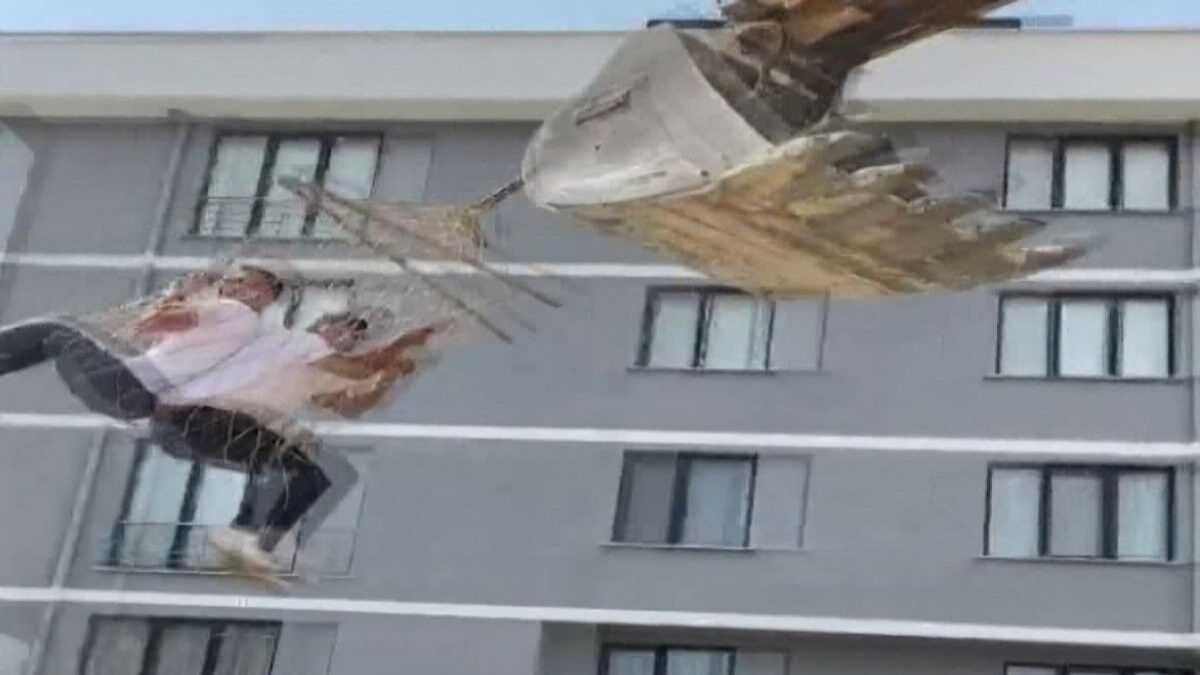 İşçilerden bazıları kepçenin ucuna bağladıkları hamağa otururken, makinenin başına geçen operatör ise kepçeyi havalandırıp, hızla döndürmeye başladı.