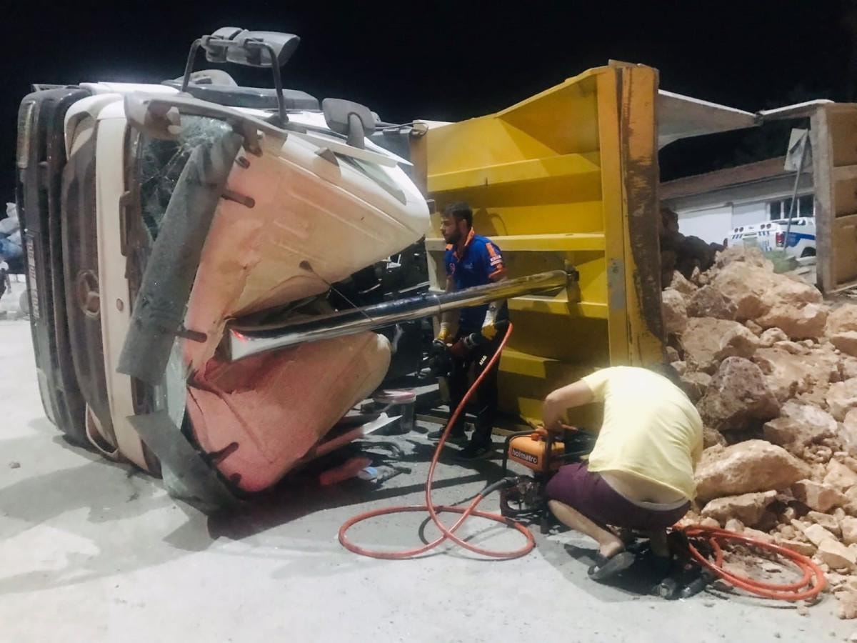 Araç sürücüsü Nihat B. devrilen kamyonun içerisinde sıkıştı. Kazayı görenler durumu 112 Acil Çağrı Merkezi'ne bildirdi.