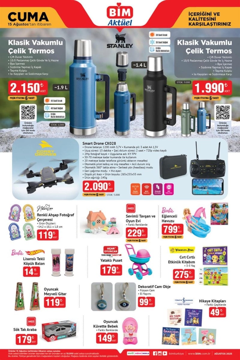 Türkiye’nin en çok tercih edilen market zincirlerinden BİM, 15 Ağustos 2025 tarihli aktüel ürün kataloğu ile yine büyük ilgi topladı. Bu hafta BİM’e Stanley termoslar geliyor.