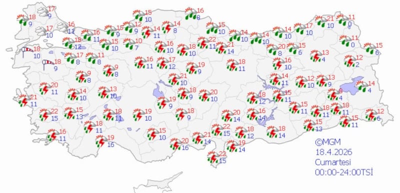 MGM'nin son verilerine göre bu hafta boyunca sağanak ve gök gürültülü sağanak yağış ülke genelinde etkili olacak. Özellikle 18-21 Nisan tarihleri arasında iç ve doğu kesimlerde yerel kuvvetli yağış, yıldırım, kısa süreli dolu ve ani sel riski öngörülüyor.
