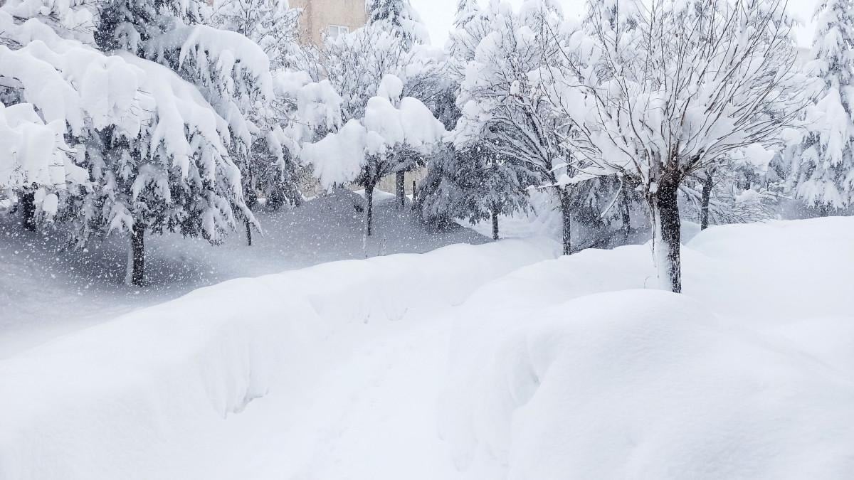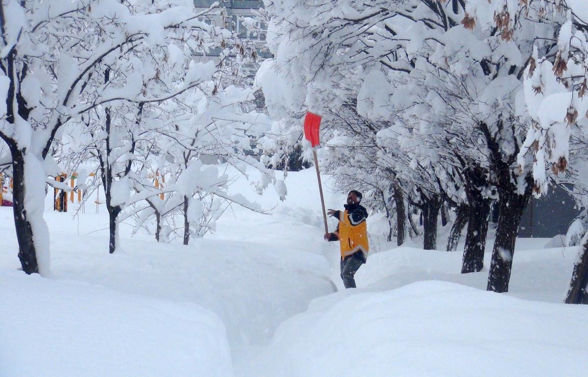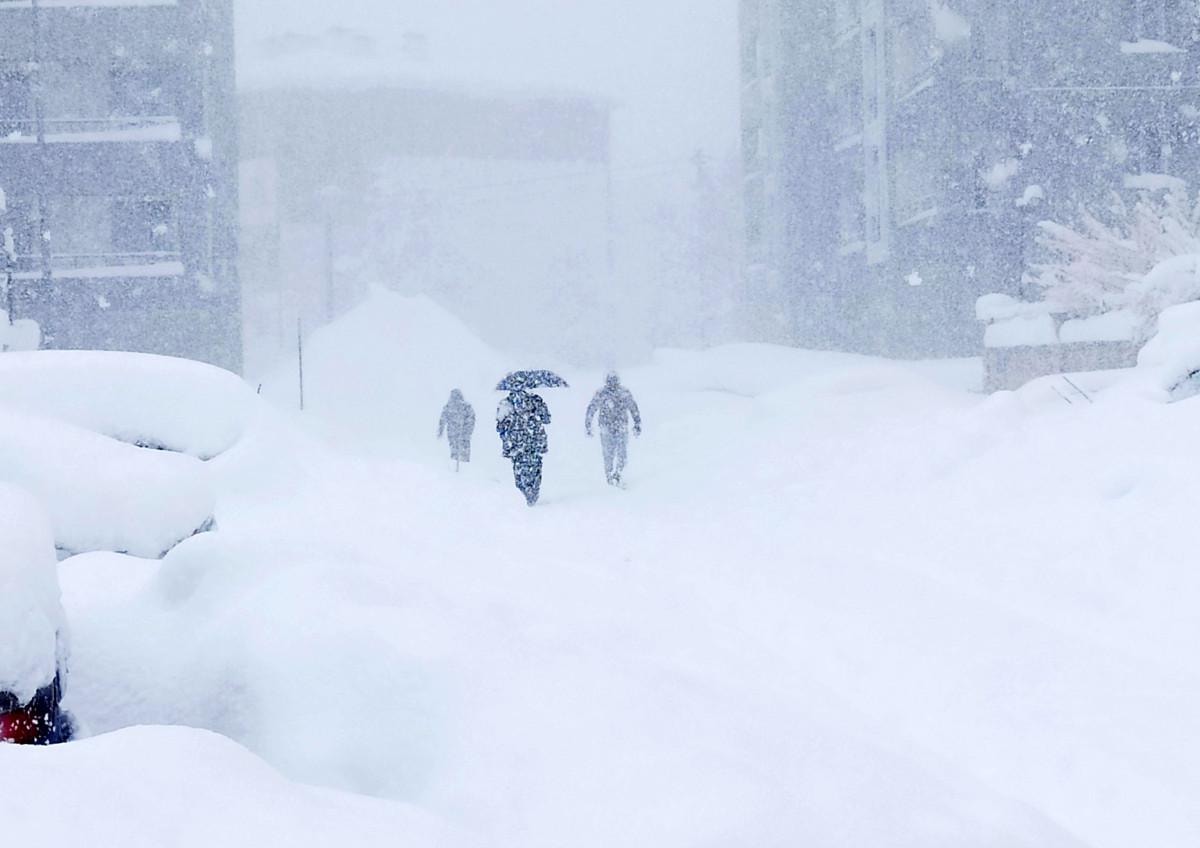 Kar yağışından dolayı tek katlı evler, arabalar ve yön levhaları kardan kayboldu.