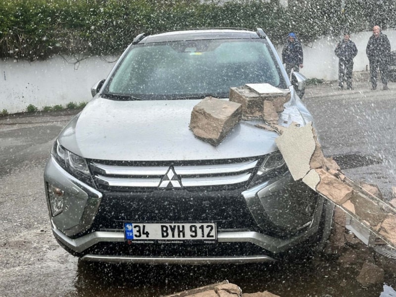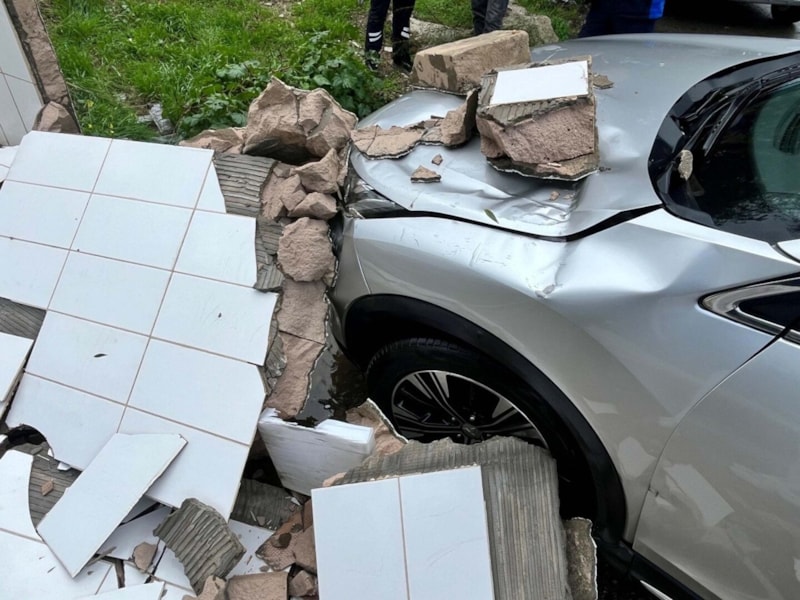Cumhuriyet Mahallesi’nde ise fırtınanın etkisiyle bir duvar, park halindeki otomobilin üzerine devrildi.
