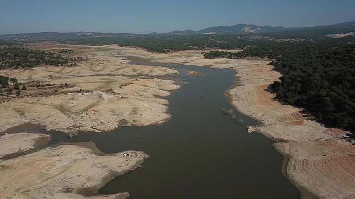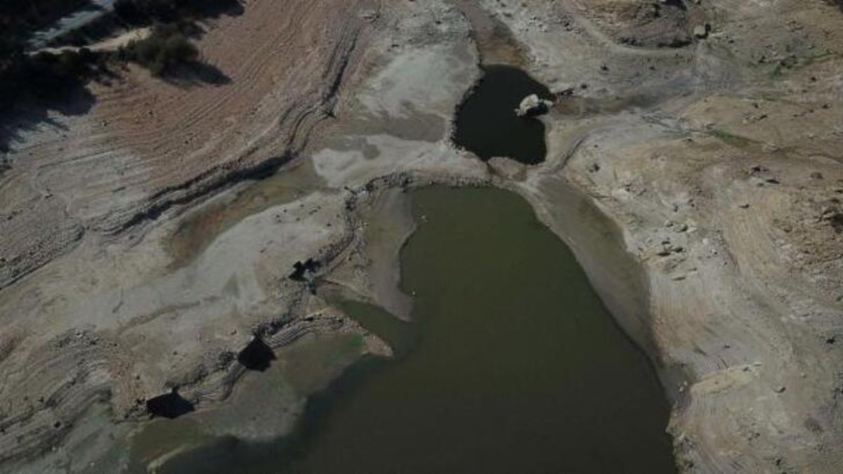 Kuraklık nedeniyle Geyik Barajı'nın belli bir havzasında su kalırken, baraj drone'la görüntülendi.