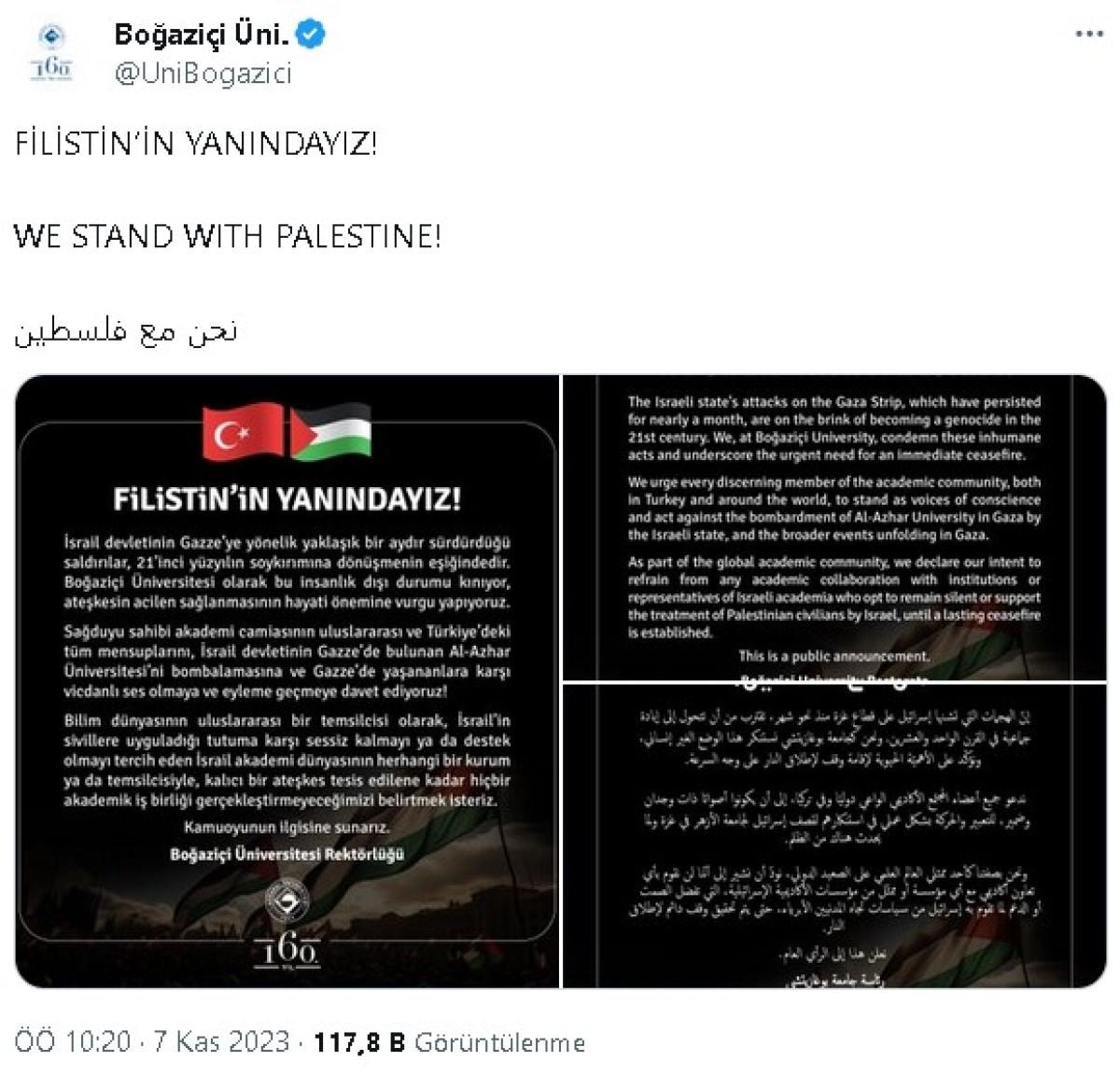 Boğaziçi Üniversitesi Rektörlüğü'nün sosyal medya hesabından "Filistin'in yanındayız" başlığıyla yapılan açıklamada, İsrail'in Gazze'ye yönelik yaklaşık 1 aydır sürdürdüğü saldırıların, 21'inci yüzyılın soykırımına dönüşmenin eşiğinde olduğu belirtildi.