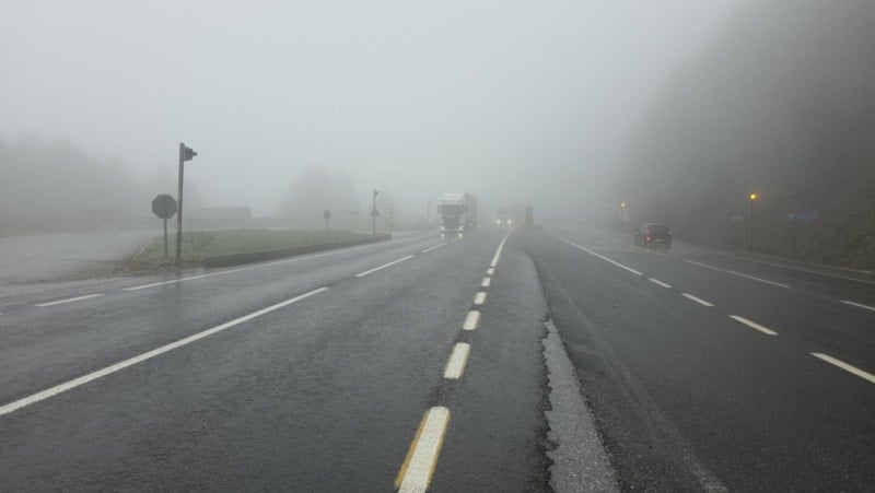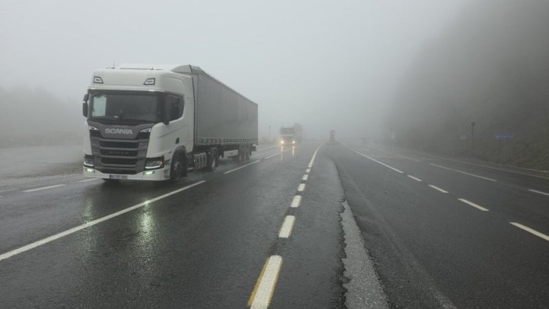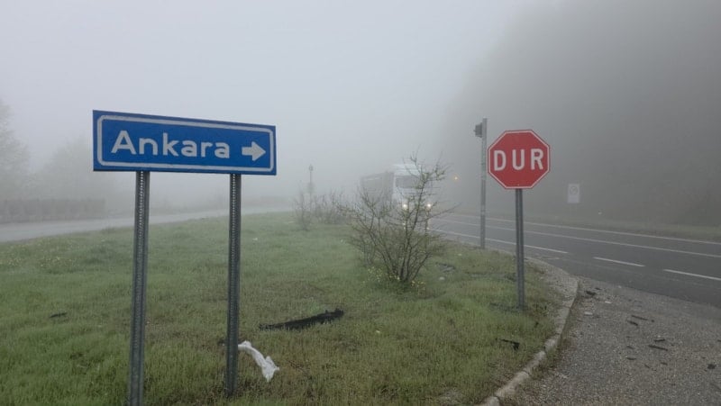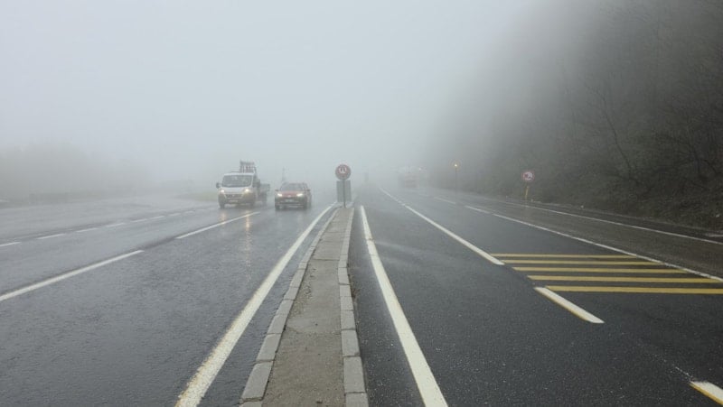 D-100 Karayolu’nun Bolu Dağı geçişinde etkili olan yoğun sis ve hafif yağış, sürücülere zor anlar yaşattı. Görüş mesafesi bazı noktalarda neredeyse tamamen kayboldu.