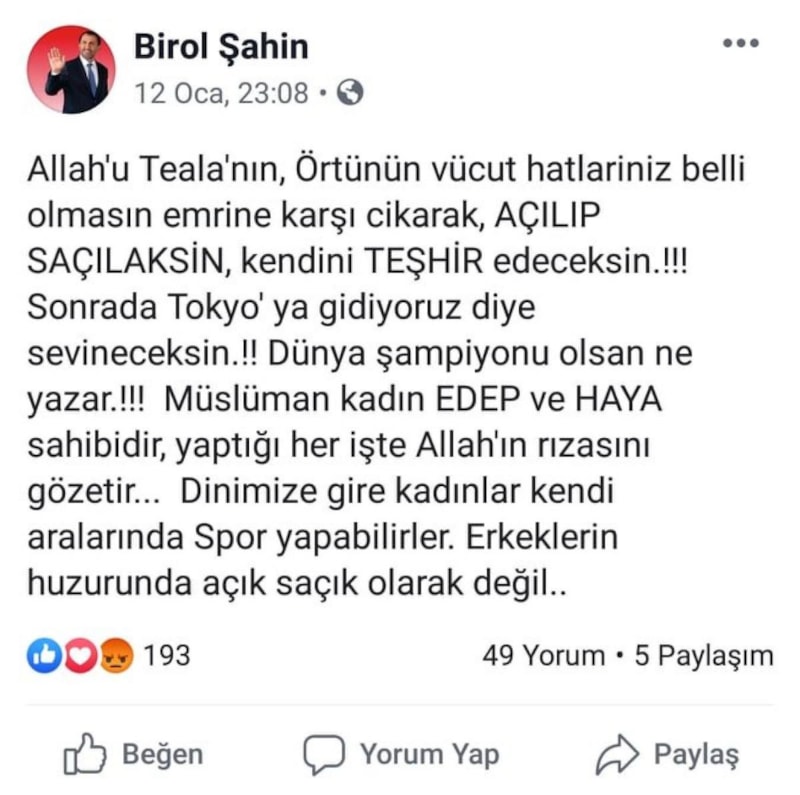 "Allahu Teala’nın ‘örtünün vücut hatlarınız belli olmasın’ emrine karşı çıkarak, açılıp saçılacaksın, kendini teşhir edeceksin sonra da ‘Tokyo’ya gidiyoruz’ diye sevineceksin. Dünya şampiyonu olsan ne yazar. Müslüman kadın adap ve haya sahibidir. Yaptığı her işte Allah rızası gözetir. Dinimize göre kadınlar kendi aralarında spor yapabilirler, erkekler huzurunda açık saçık olarak değil”
