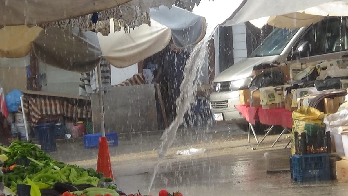 Aniden bastıran sağanak nedeniyle semt pazarındaki esnaf ve vatandaşlar zor anlar yaşadı.