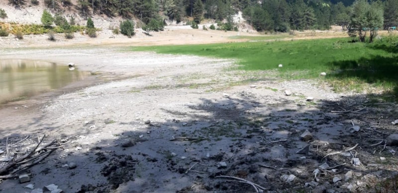 Mudurnu ilçesinde çıkan orman yangınlarında kritik rol oynayan, helikopterlerin sorti yaptığı Beyderesi Göleti, kuraklıkla karşı karşıya kaldı.