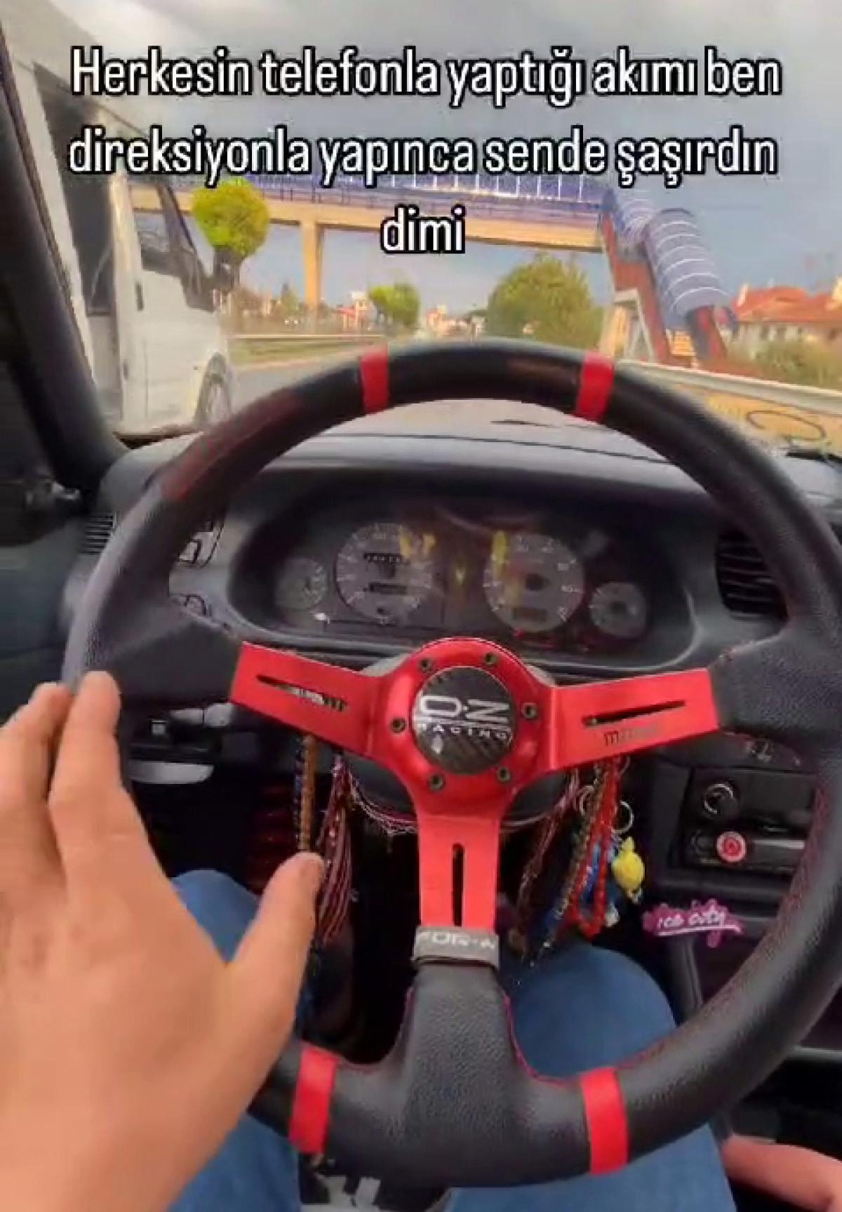 B.E., otomobiliyle bir süre direksiyonsuz ilerlerken, o anları ‘Herkesin telefonla yaptığı akımı ben direksiyonla yapınca sen de şaşırdın değil mi?’ notuyla sosyal medya hesabında paylaştı.