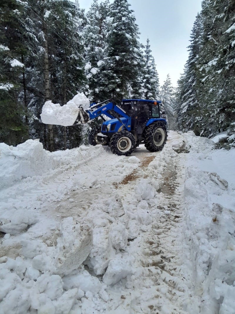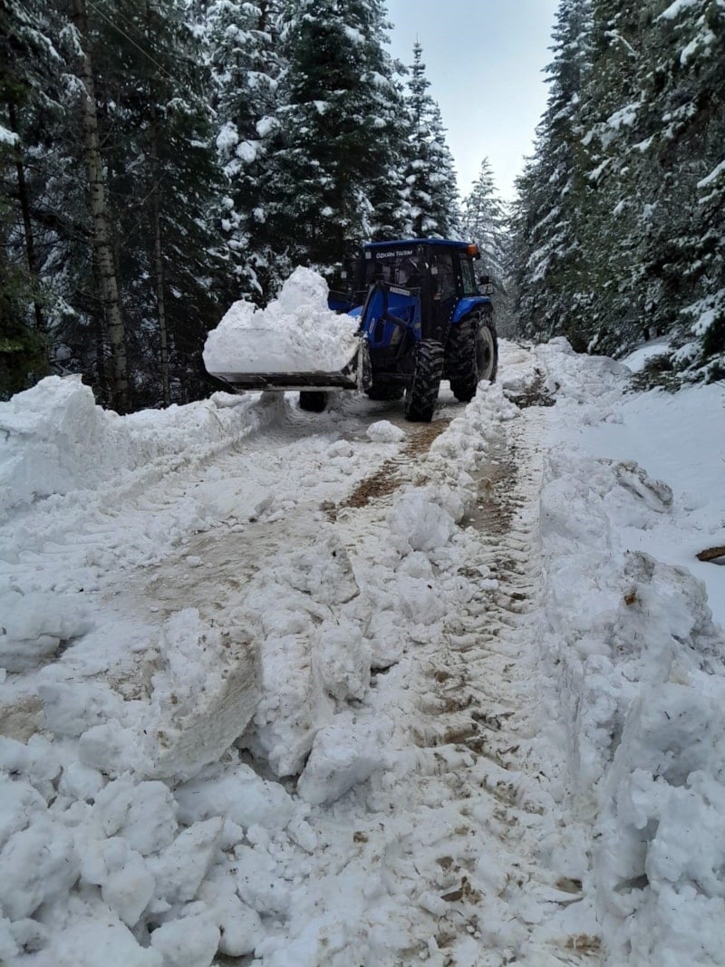 Bolu’nun yüksek kesimlerinde etkili olan kar yağışı sonrası kapanan yayla yolları, köylülerin traktörle yaptığı çalışmalarla yeniden ulaşıma açıldı.