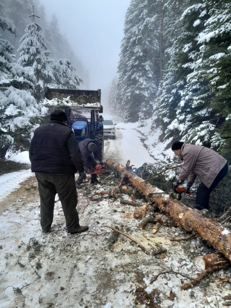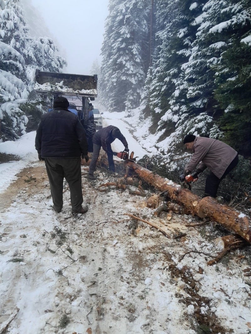 Çalışmalar sırasında karın ağırlığına dayanamayıp yola devrilen ağaçlar da ekipler tarafından kaldırıldı.