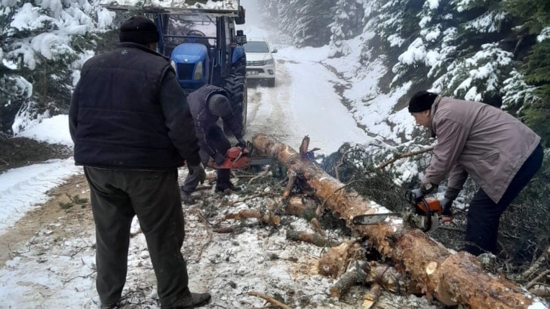 Vatandaşlar, yolu tamamen ulaşıma açabilmek için ağaçları yol kenarına taşıdı.