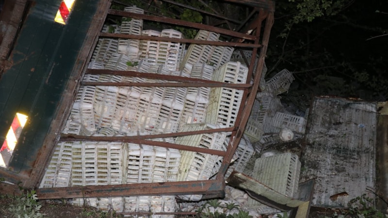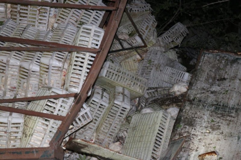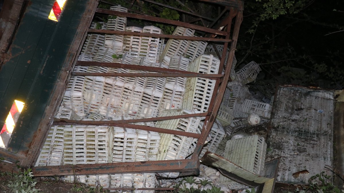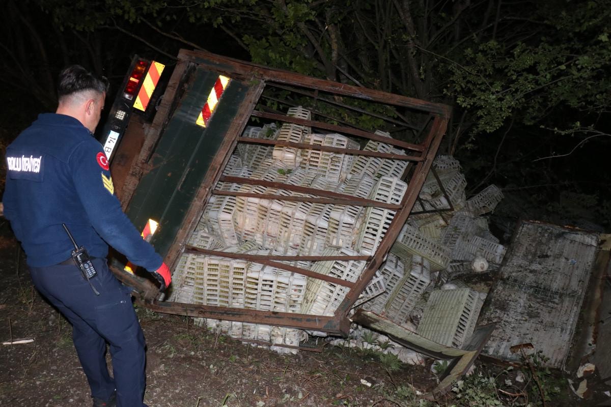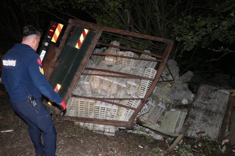 Uçurumdan uçan kamyonun kasasında yüklü olan yaklaşık 3 bin adet canlı tavuğun yüzlercesi telef oldu.