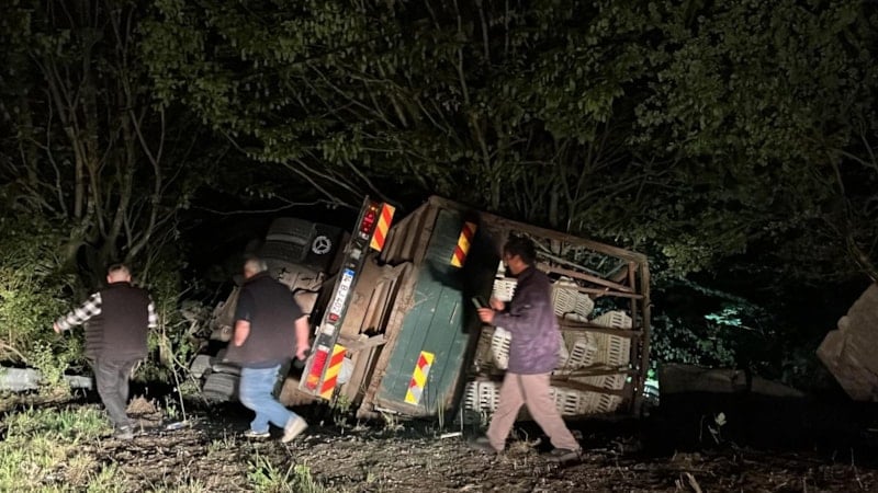 Bolu’da frenleri boşalan canlı tavuk yüklü kamyon virajı alamayarak uçurama devrildi. Kazada kamyon sürücüsü yaralanırken, onlarca canlı tavuk telef oldu.