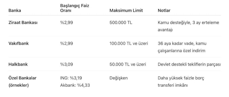 5 Ekim 2025 itibarıyla kamu ve özel bankaların borç kapatma kredilerine ilişkin güncel faiz oranları ve limitleri şöyle: