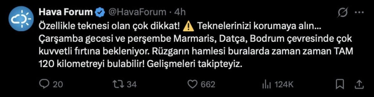 “Özellikle teknesi olan çok dikkat! Teknelerinizi korumaya alın... Çarşamba gecesi ve perşembe Marmaris, Datça, Bodrum çevresinde çok kuvvetli fırtına bekleniyor. Rüzgarın hamlesi buralarda zaman zaman TAM 120 kilometreyi bulabilir! Gelişmeleri takipteyiz.”