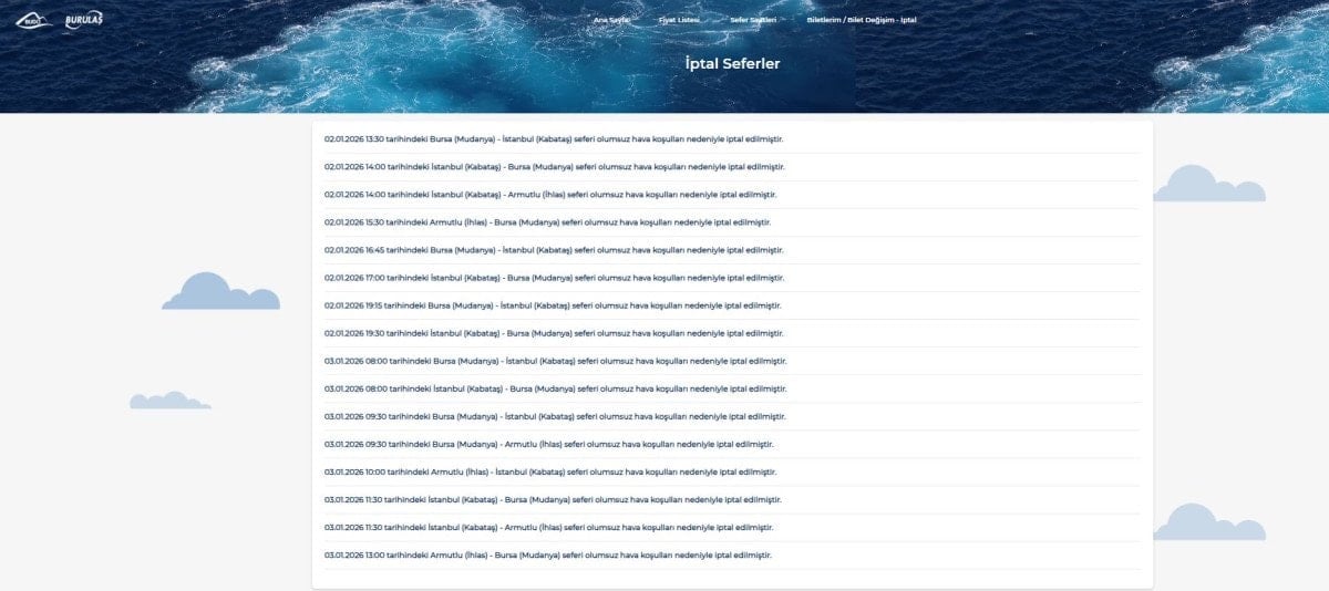 Açıklamada, saat 08.00'deki ve 09.30'daki Bursa (Mudanya)-İstanbul (Kabataş), 08.00'deki ve 11.30'daki İstanbul (Kabataş)-Bursa (Mudanya), 09.30'daki Bursa-Armutlu, 10.00'daki Armutlu-İstanbul, 11.30'daki İstanbul-Armutlu ve 13.00'deki Armutlu-Bursa seferleri olumsuz hava koşulları nedeniyle iptal edildiği bildirildi.