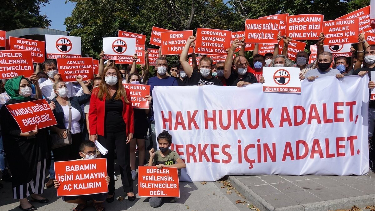 “Hak hukuk adalet, herkes için adalet” yazılı pankart açan katılımcılar, “Büfeler yenilensin işletmeciler değil”, “Yandaş değil emekçiyiz”, “Koronayla savaşmak istiyoruz sizinle değil” şeklinde dövizler taşıdı.