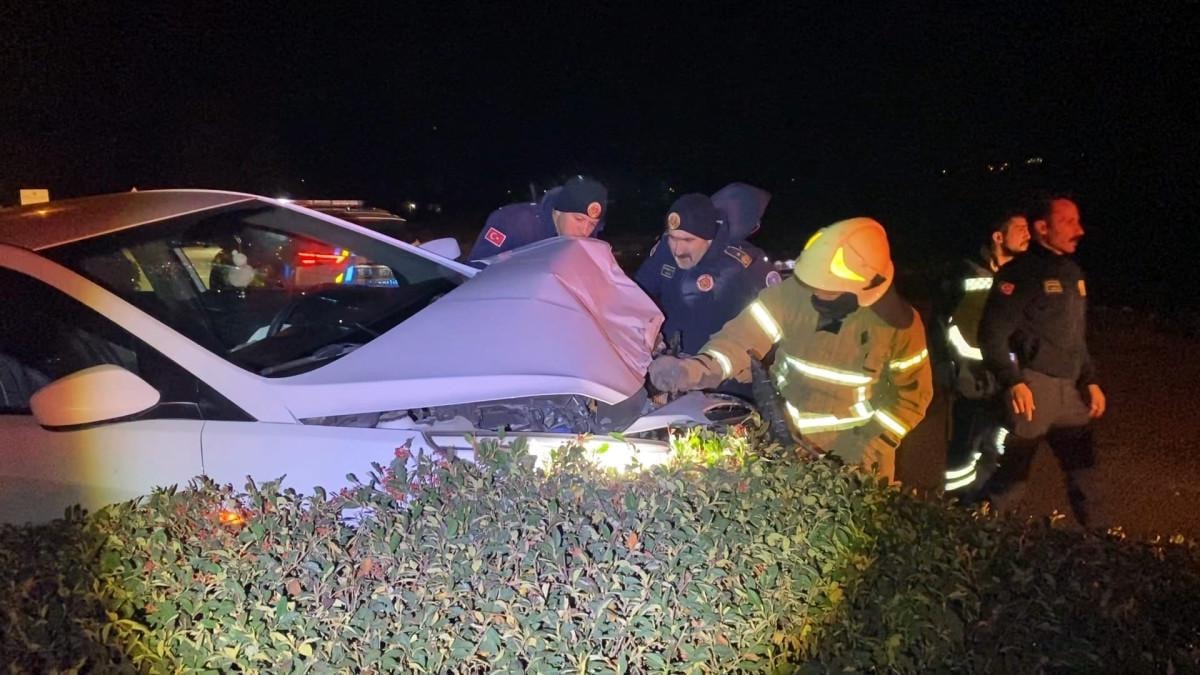 Çarpmanın etkisiyle kontrolden çıkan 16 MB 9304 plakalı otomobil, refüje çıkıp çarptığı aydınlatma direğini devirdi.