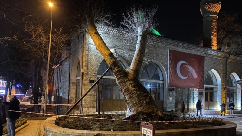Bursa'nın İnegöl ilçesinde Fatih Sultan Mehmed ve II. Bayezid devri devlet adamlarından İshak Paşa tarafından yaklaşık 600 yıl önce yaptırılan İshak Paşa Cami'nin girişinde bulunan asırlık çınar ağacı kökünden çıkarak devrildi.