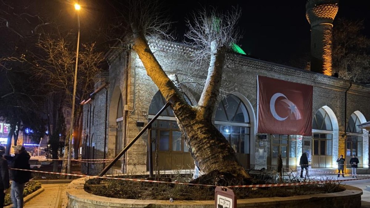 Bursa'da yaklaşık 600 yıl önce yaptırılan İshakpaşa Camii'nin bahçesindeki 550 yaşındaki çınar ağacı kökünden çıkarak devrildi.