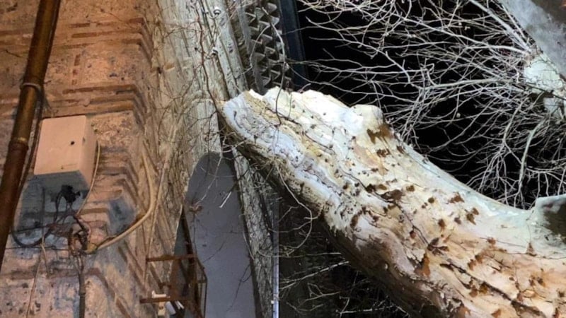 Caminin duvarına dayanan ağacın gövdesinden parçalar yere düştü.