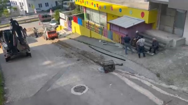 Bursa'da anaokulu önündeki sokaktaki altyapı çalışması esnasında, patlayan doğalgaz borusu herkesin yüreğini ağzına getirdi.