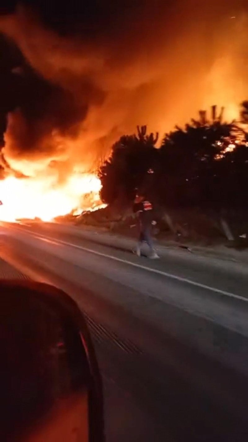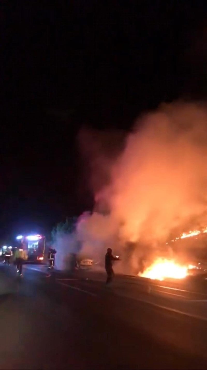Yangın yol kenarındaki ormana da sıçradı. Yangın yerine çok sayıda itfaiye ekibi sevk edildi.