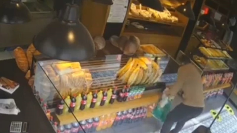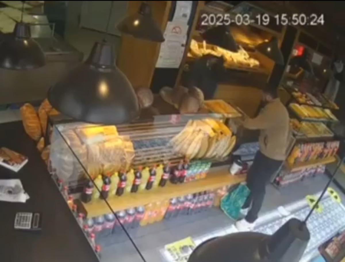 Ekmek aldıktan sonra telefonla konuşuyormuş gibi yapıp çalışanların dikkatini dağıtan şahıs, bir anda kumbarayı poşetinin içine atarak uzaklaştı.