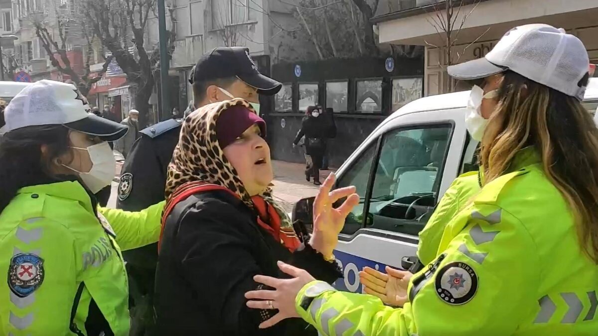 Ekipler Nurdan B.’yi araca binmesi için ikna etmeye çalışırken, polise, "Sizinle işim yok, bırakın bizi gidelim. Biz buraya nereden geldik? Maske cezası yazacaksanız yazın, sonra bırakın gidelim." diyen Nurdan B., daha sonra kadın polis memuruna, "Kadının kadını tutması lazım, beni bırak. Kadın kadını tutarsa erkekler geride durur." diyerek kendisine destek olmasını istedi.